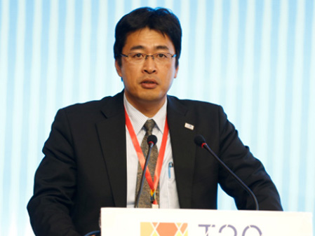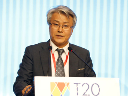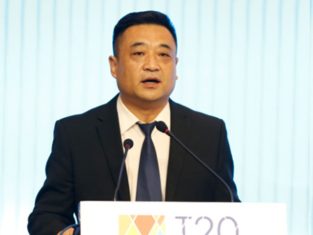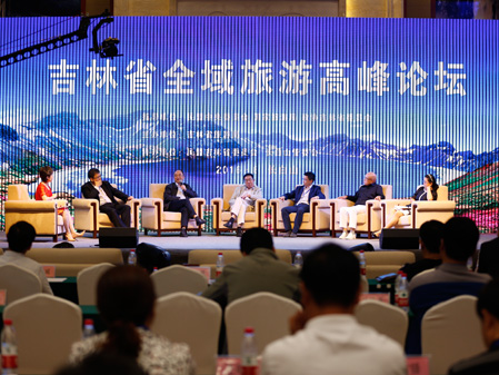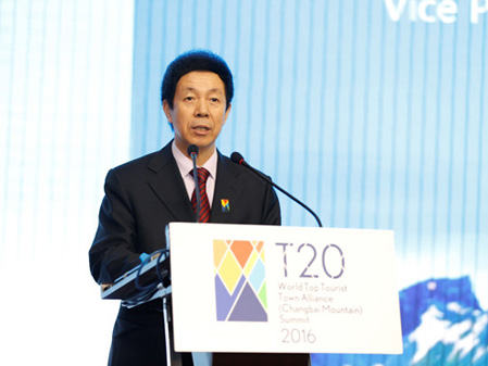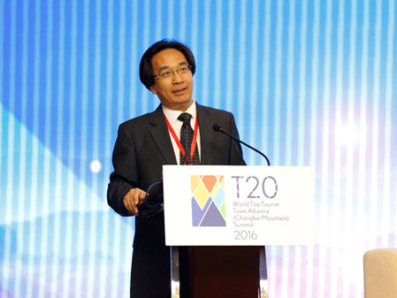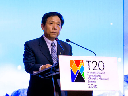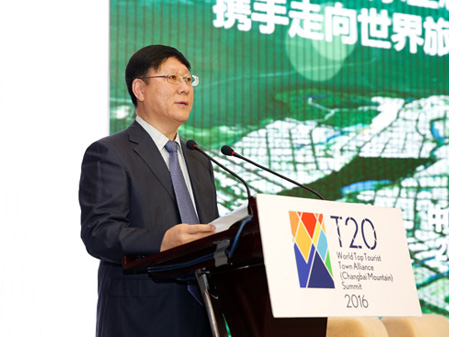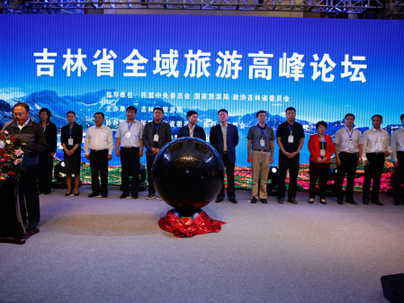 中共吉林省委副书记马俊清、吉林省副省长李晋修、国际旅游学会副会长拉斯罗-普兹科和主任戴维-钮森,共同为“T20世界旅游名镇联盟纪念雕塑”揭幕。